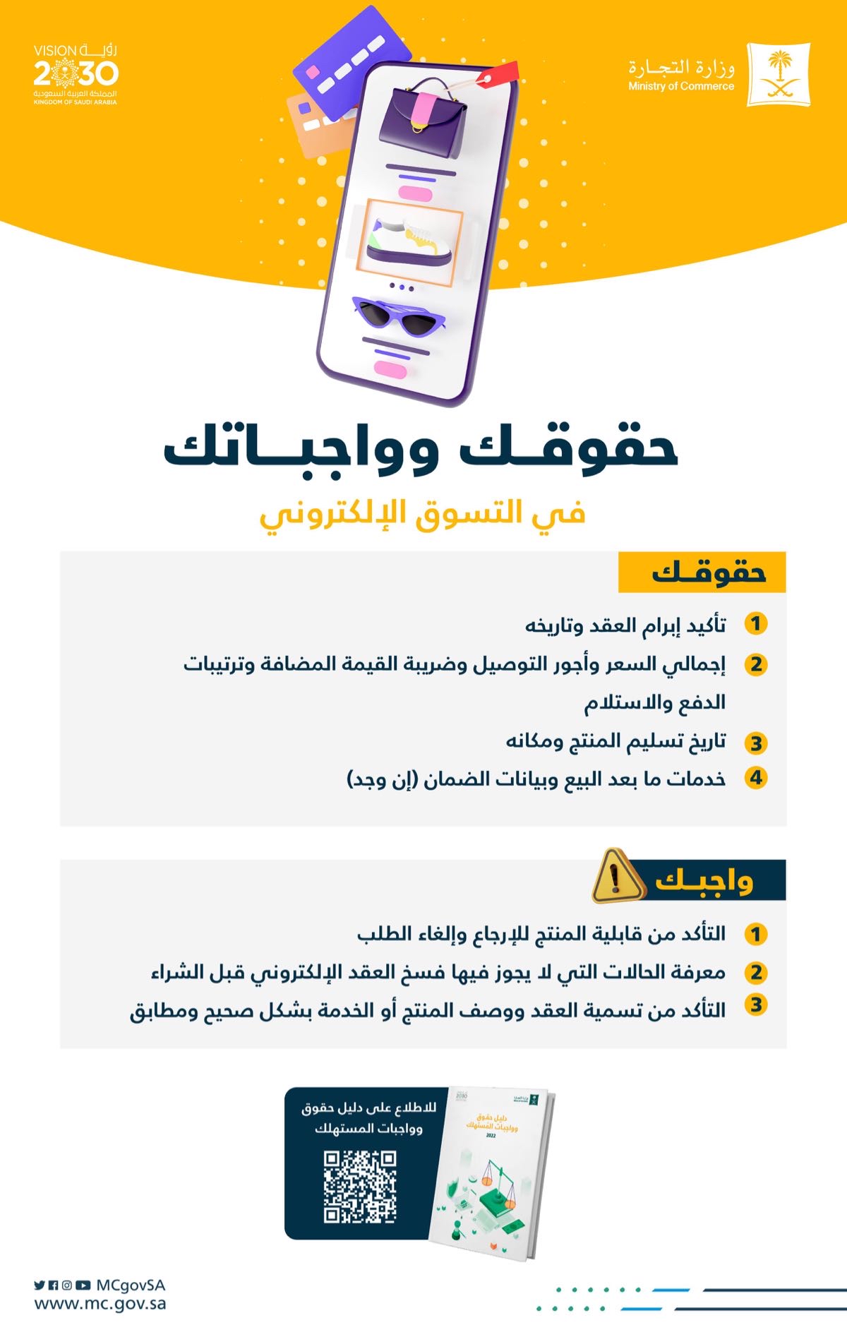 كشفت وزارة التجارة حقوق وواجبات المستهلك عند التسوّق الإلكتروني، داعية إلى الاطلاع على دليل حقوق وواجبات المستهلك.