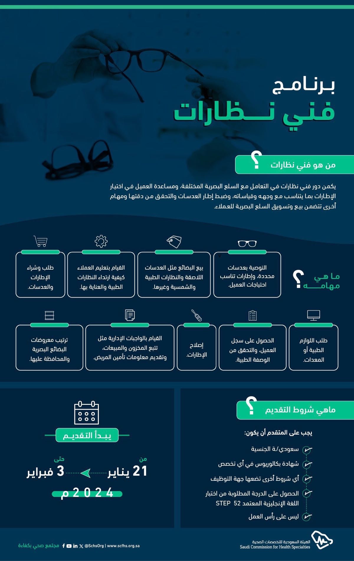 أعلنت الهيئة السعودية للتخصصات الصحية، اليوم الأحد، عن بدء التقديم على برنامج ”فني نظارات“، وذلك عن طريق البوابة الإلكترونية الخاصة بالهيئة.
