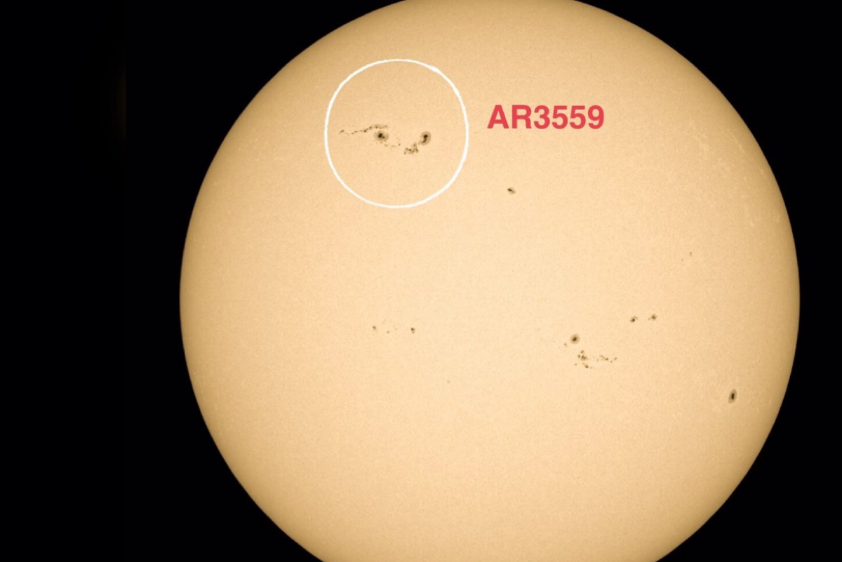 وقال: إن حجم البقعة الشمسية AR3559 تضاعف ثلاث مرات خلال اليومين الماضيين وأصبحت أوسع بعشر مرات من الأرض وهي تمتلك أكثر من 12 نوى داكنة.