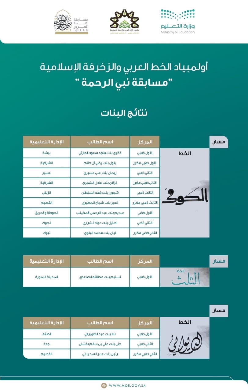 ومن جهة أخرى، حقق الطالب مازن عماد الأحمد، من تعليم المنطقة الشرقية، المركز الأول ”فضي“ ضمن المنافسات في مسار خط الثلث.