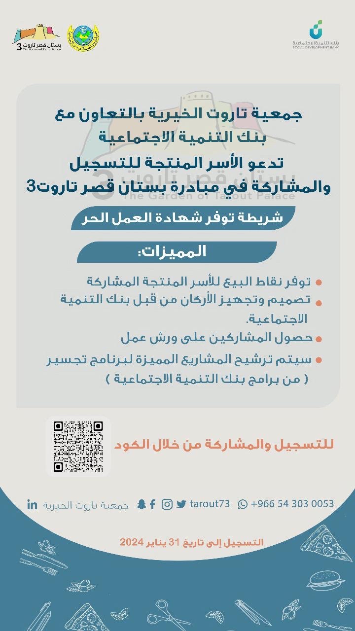دعت جمعية تاروت الخيرية، بالتعاون مع بنك التنمية الاجتماعية، الأسر المنتجة، إلى التسجيل والمشاركة في مبادرة ”بستان قصر تاروت 3“، شريطة توفر شهادة العمل الحر.