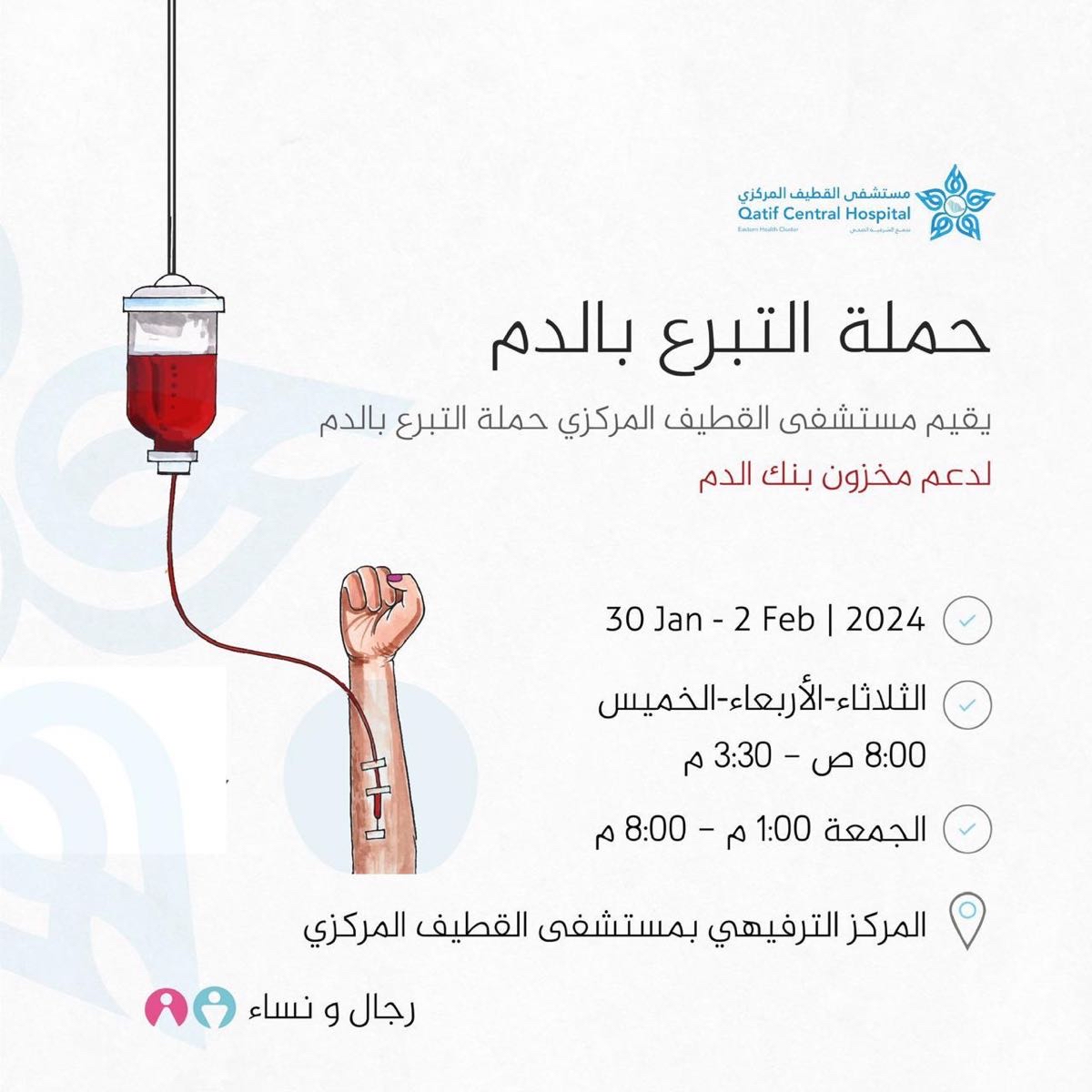 ينظم مستشفى القطيف المركزي حملة تبرع بالدم يوم غدٍ الجمعة، وذلك لدعم مخزون بنك الدم بالمستشفى.