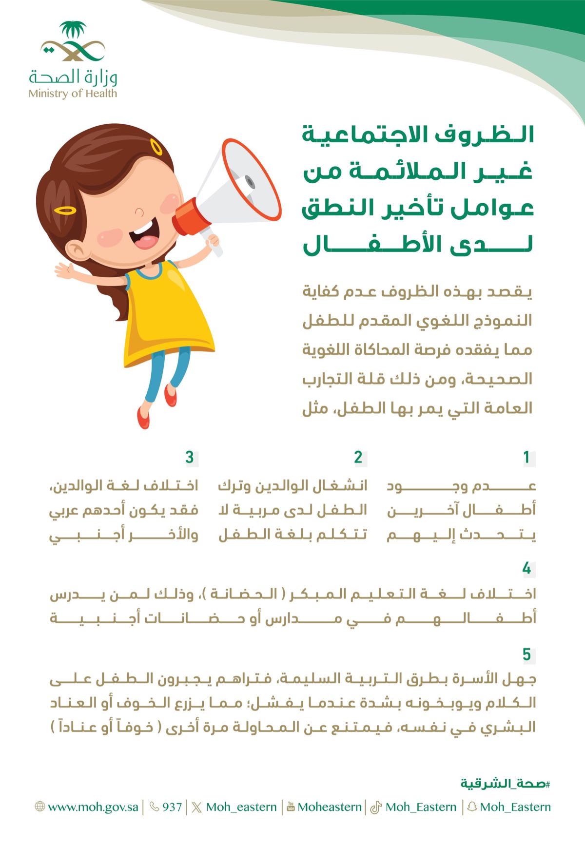 حددت ”صحة الشرقية“، 5 عوامل لتأخير النطق لدى الأطفال، بسبب التأثر بالظروف الاجتماعية المحيطة، مشيرة إلى تلك العوامل تسهم في عدم كفاية النموذج اللغوي المقدم للطفل، ما يفقده فرصة المحاكاة اللغوية الصحيحة، ومن ذلك قلة التجارب العامة التي يمر بها الطفل.