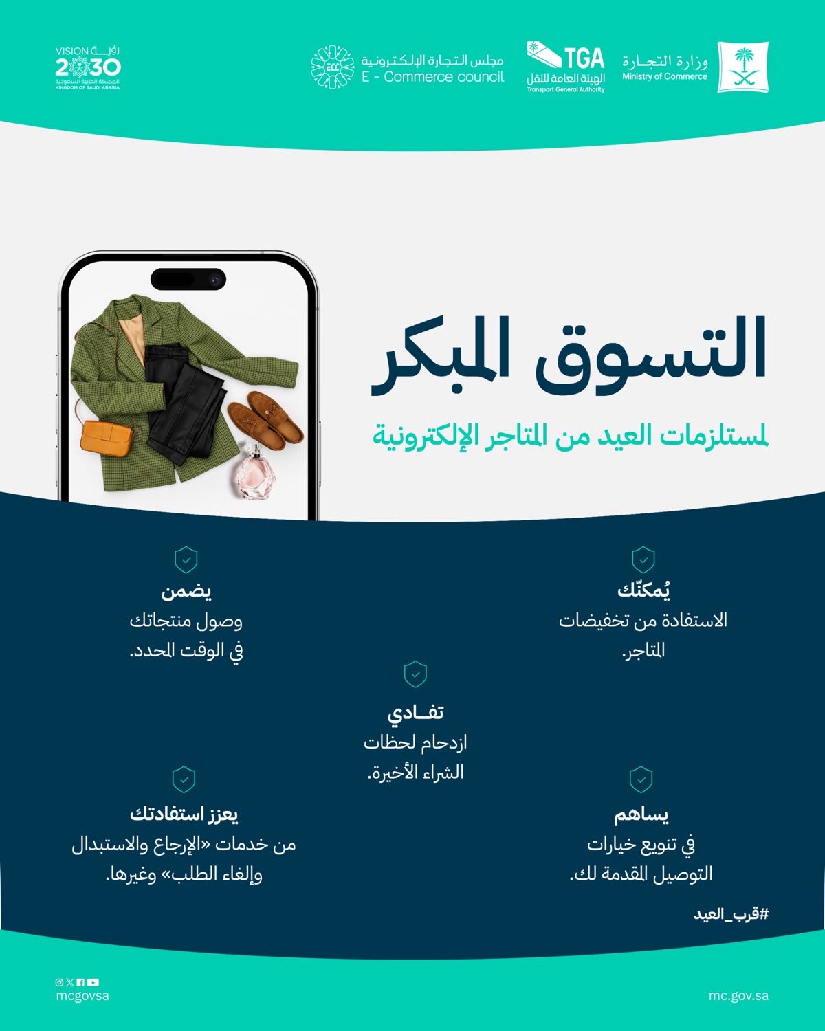 حثت وزارة التجارة والهيئة العامة للنقل متسوقي المتاجر الإلكترونية على التسوق المبكر لمستلزمات العيد لتجنب ازدحام لحظات التسوق الأخيرة.