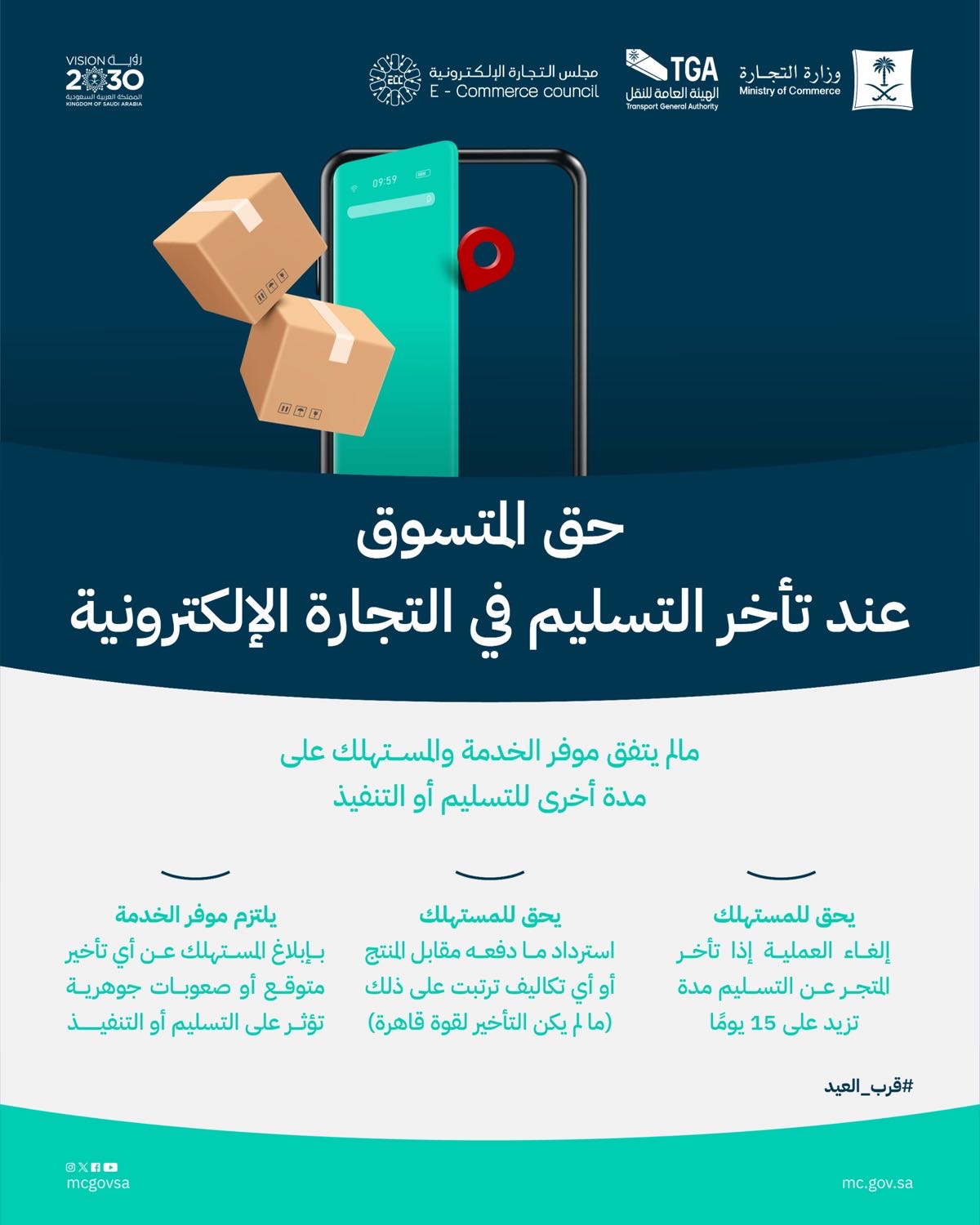 وحددت الوزارة حقوق المتسوق عند تأخر التسليم في التجارة الالكترونية، ما لم يتفق موفر الخدمة والمستهلك على مدة أخرى للتسليم أو التنفيذ.