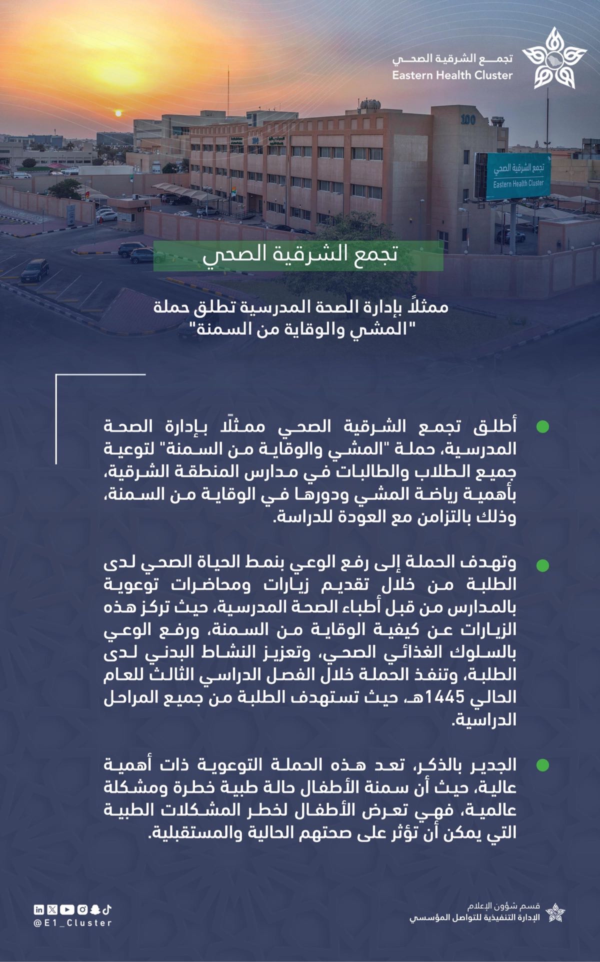 انطلقت حملة «المشي والوقاية من السمنة»، التي تنظمها إدارة الصحة المدرسية في تجمع الشرقية الصحي، في مدارس المنطقة الشرقية، وذلك بالتزامن مع بدء الفصل الدراسي الثالث للعام الدراسي الجاري 1445 هـ.