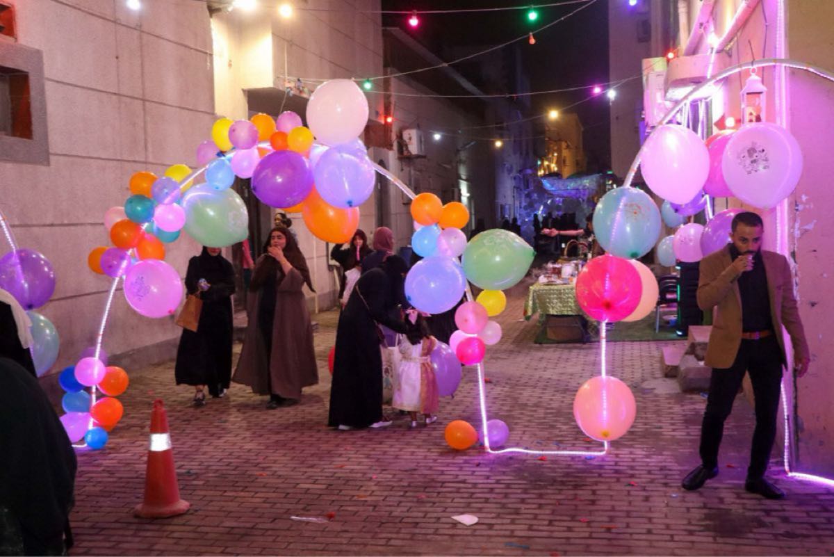 وأظهرت الصور، التي التقطها فريق ”جهات“، أجواءً احتفاليةً مميزة، حيث ازدانت المنازل والشوارع بالزينة، وتوافد الأطفال، بِلباسهم الأنيق، حاملين أكياسهم الملونة، لتلقي ”البركة“ من الحلويات والمكسرات، من البيوت المُشاركة في هذه العادة.