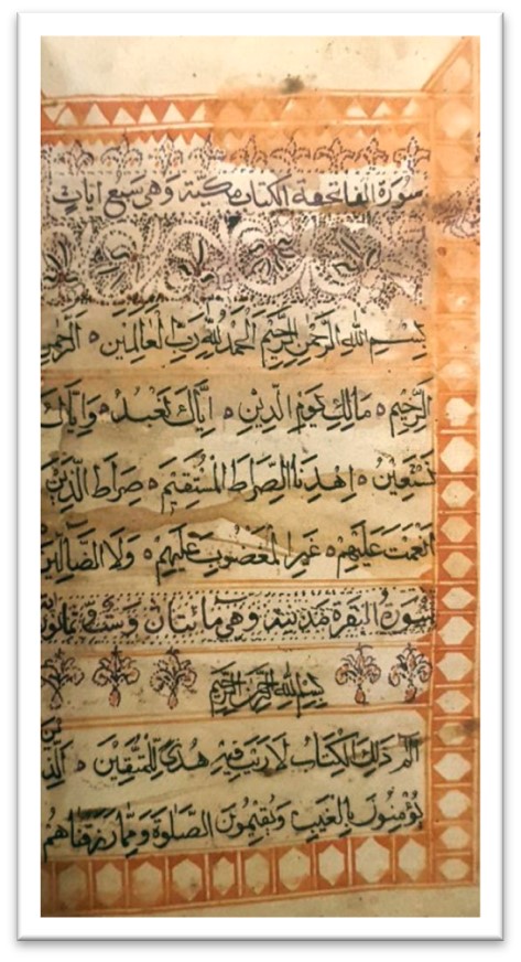 - الأولى: في الأعلى على شكل زخرفة نصف دائرية تتوسط منتصف الصفحة مطرزة بخطين افقيين من نفس لون الخطوط البرتقالية الرأسية لتحديد نهاية الآية، وهذا الشكل النصف دائري محدد دورانه بأقواس صغيرة متتالية مرسومة بأسلوب التنقيط باللون الأسود ومطعمة بنقط برتقالية على الجوانب