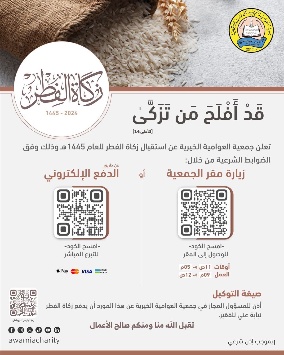 أعلنت جمعية العوامية الخيرية عن بدء استقبال زكاة الفطر للعام 1445ه، إيماناً منها بأهمية هذا الركن من أركان الإسلام، وحرصاً على إيصالها لمستحقيها في وقتها الشرعي تسهيلاً على المزكين.