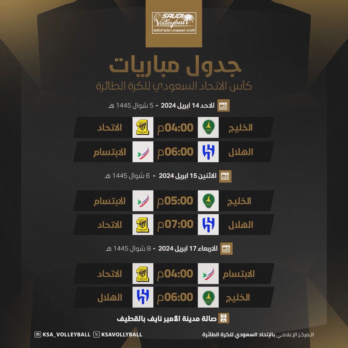 تنطلق الجماهير الرياضية ”عشاق الرياضة“ إلى صالة مدينة الأمير نايف الرياضية بمحافظة القطيف، دعوة عامة من الاتحاد السعودي للكرة الطائرة، لجميع الرياضيين ومشجعي الرياضة للحضور المتألق، اعتبارا من الساعة الرابعة 4 مساءً من يوم الأحد القادم 14 أبريل 2024 الموافق 5 شوال 1445 ولمدة ثلاثة أيام.