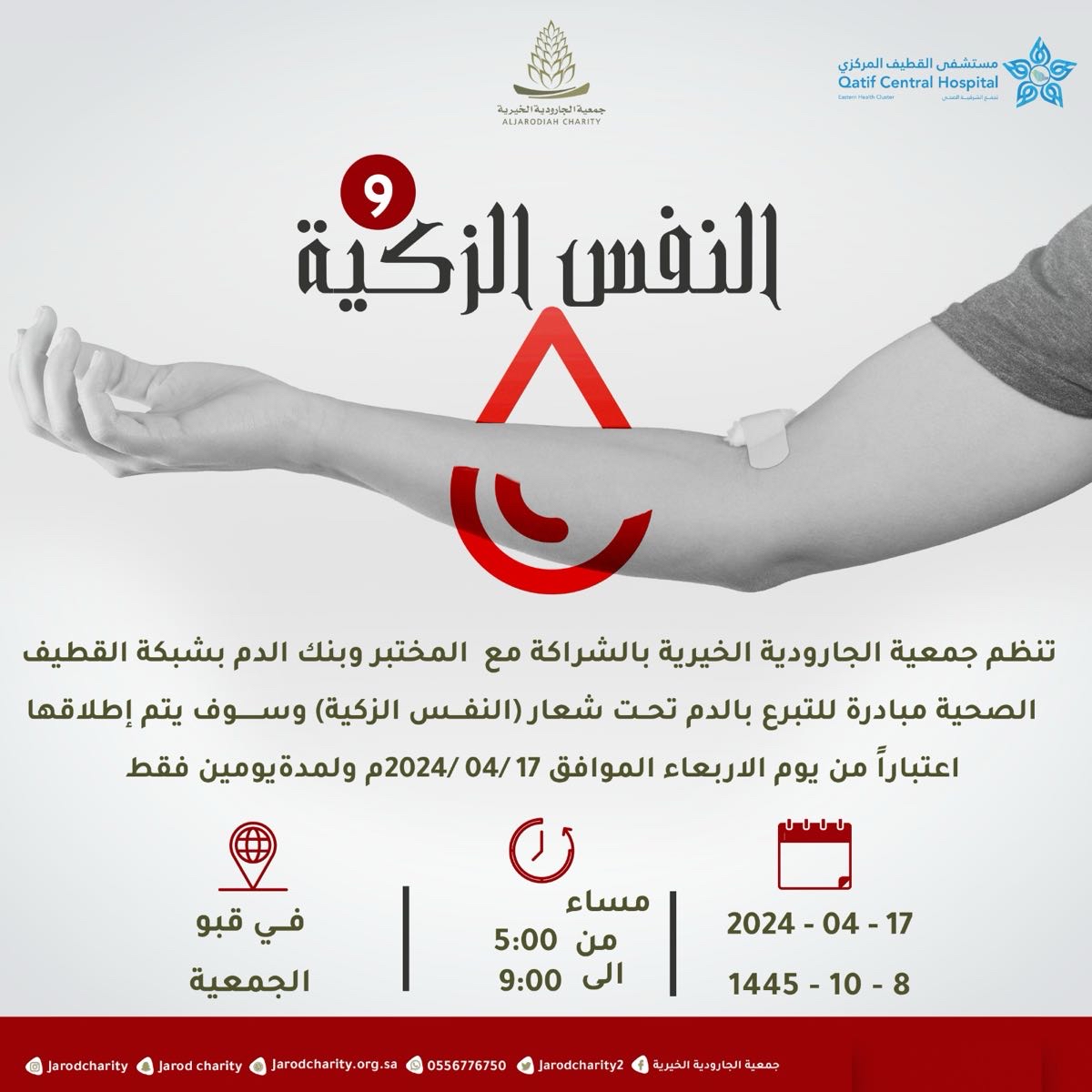 تنظم جمعية الجارودية الخيرية، بالشراكة مع المختبر، وبنك الدم بشبكة القطيف الصحية، مبادرة للتبرع بالدم تحت شعار ”النفس الزكية“.