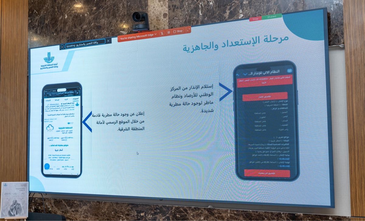 واستعرض م. الجبير الجهود المبذولة لمواجهة الحالة المطرية، والذي تضمن عددً من المحاور جاء أبرزها مرحلة الاستعداد والجاهزية، ومرحلة الاستجابة للحالة المطرية، ومرحلة التعافي، من خلال استعراض تقرير للحالة المطرية تضمن جاهزية وفعالية محطات تصريف مياه الأمطار بالمنطقة، ومشاركة فرق الطوارئ.