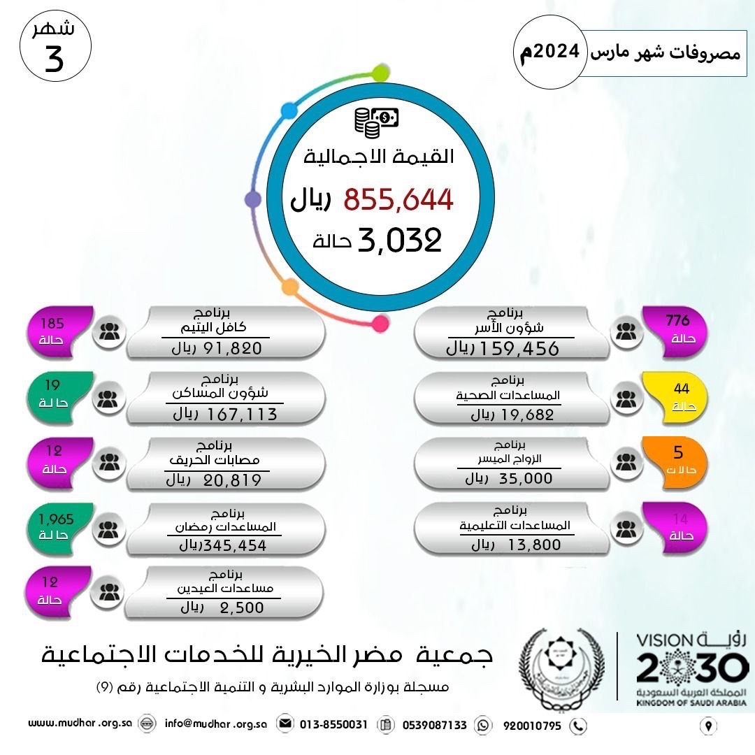 كشف تقرير الإدارة المالية بجمعية مضر الخيرية بالقديح، أن مصروفات البرامج الرعوية والتنموية في شهر مارس الماضي، بلغت 855 ألفًا و644 ريالًا، استفادت منها 3,032 حالة من الأسر المتعففة.