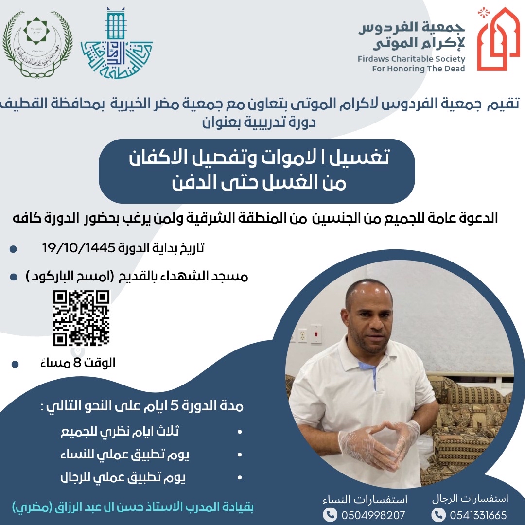 تحت عنوان ”تغسيل الأموات وتفصيل الأكفان من الغسل حتى الدفن“، تنظم جمعية الفردوس لإكرام الموتى، دورة تدريبية بالتعاون مع جمعية مضر الخيرية بمحافظة القطيف.