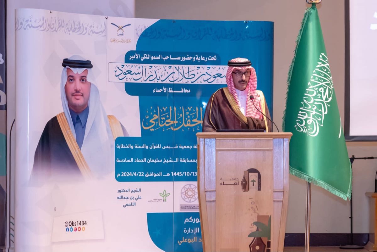 رعى الأمير سعود بن طلال بن بدر محافظ الأحساء الحفل الختامي لفعاليات وأنشطة جمعية الأمير محمد بن فهد بن جلوي ”قبس“ للقرآن والسنة والخطابة، وذلك بجمعية أدباء، وبحضور أصحاب السمو والفضيلة والمعالي، وعدد من مسؤولي الجهات الحكومية والداعمين.