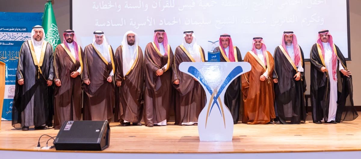 وكرّم الفائزين بمسابقة الشيخ سليمان الحماد الأسرية للقرآن والسنة والدورات القرآنية والداعمين، والمتطوعين وبعض مدراء الجهات الحكومية والخاصة الذين أسهموا في نشاطات جمعية الأمير محمد بن فهد بن جلوي ”قبس“ للقرآن والسنة والخطابة.