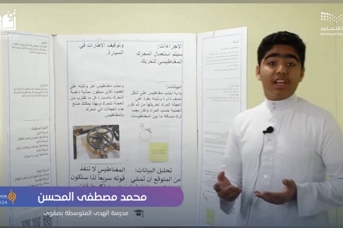 استعرض الطالب ”محمد مصطفى المحسن“، من مدرسة الهدى المتوسطة بصفوى بمحافظة القطيف، مشروعه في مجال التقنيات الهندسية، والذي جاء بعنوان ”السيارة المغناطيسية“ ضمن المشاريع المشاركة في أولمبياد البحث العلمي والابتكار الثامن بالقطيف 2024، والذي ينظمه مكتب التعليم بمحافظة القطيف خلال المدة 19-22 شوال 1445 هـ.