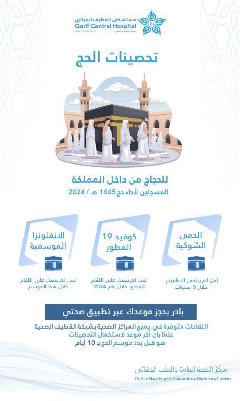 أعلنت شبكة القطيف الصحية اليوم عن توفر تطعيمات الحج للحجاج المسجلين لأداء فريضة الحج لعام 1445 هـ / 2024 م، وذلك في جميع مراكز الرعاية الصحية الأولية التابعة للشبكة.