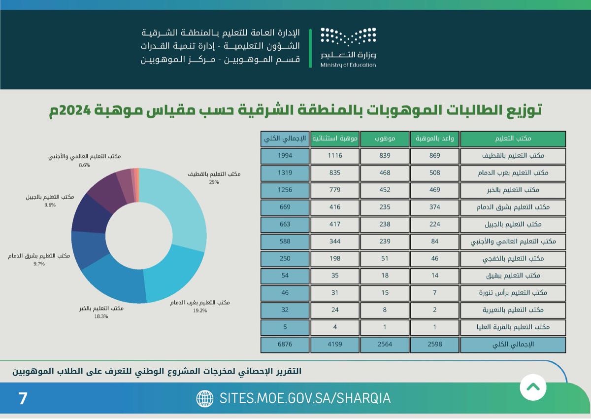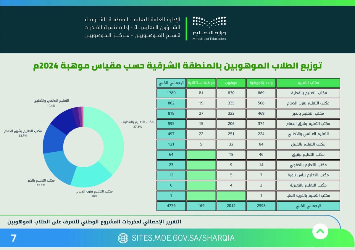 تصدر مكتب التعليم بمحافظة القطيف قائمة أعداد الموهوبين والموهوبات على مستوى مكاتب التعليم بالمنطقة الشرقية «بنين - بنات»، بواقع 3774 موهوبًا وموهوبة بينهم 1197 موهبة استثنائية.