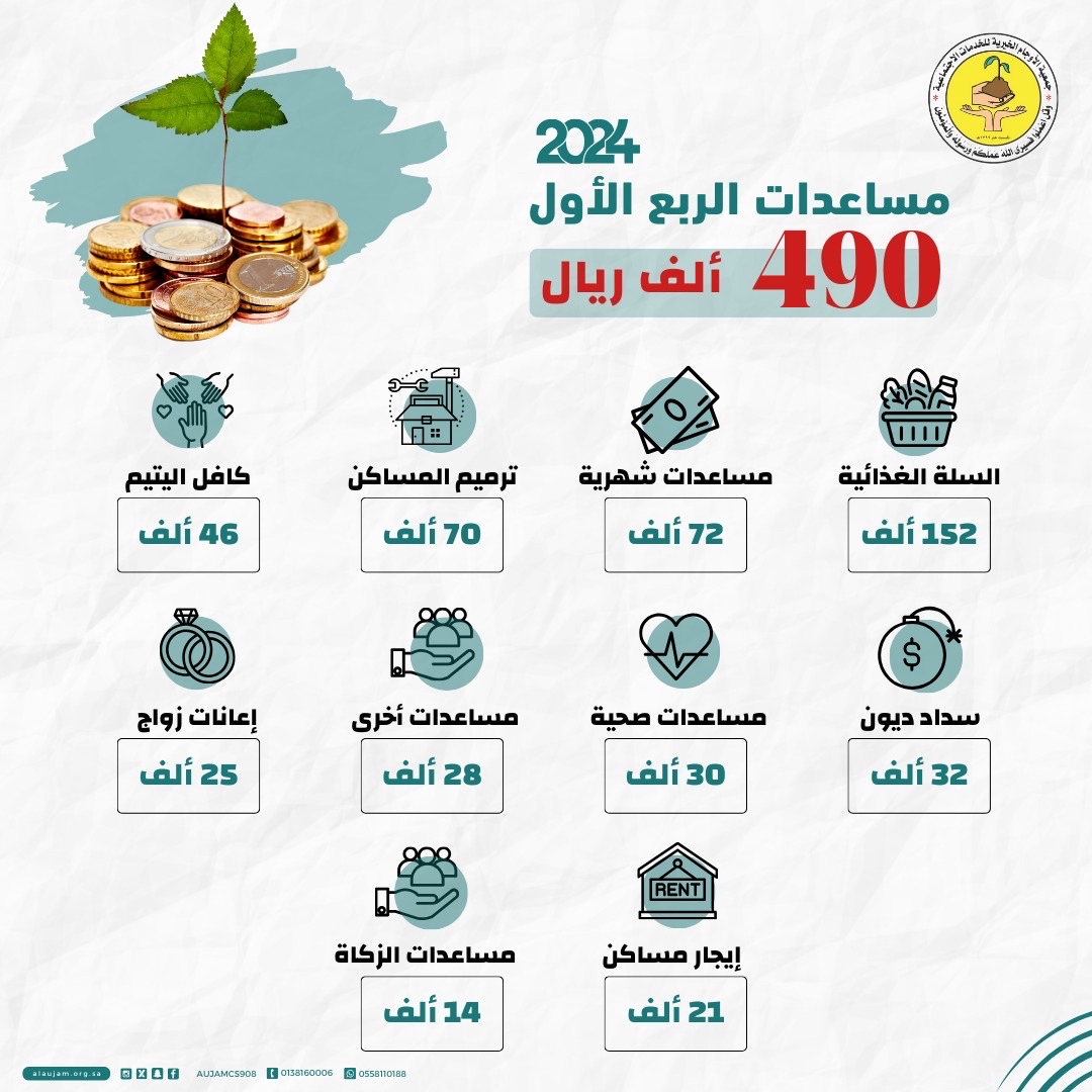 كشفت جمعية الأوجام الخيرية للخدمات الاجتماعية، أن إجمالي المساعدات التي قدمتها، خلال الربع الأول من العام الجاري، بلغ 490 ألف ريال.