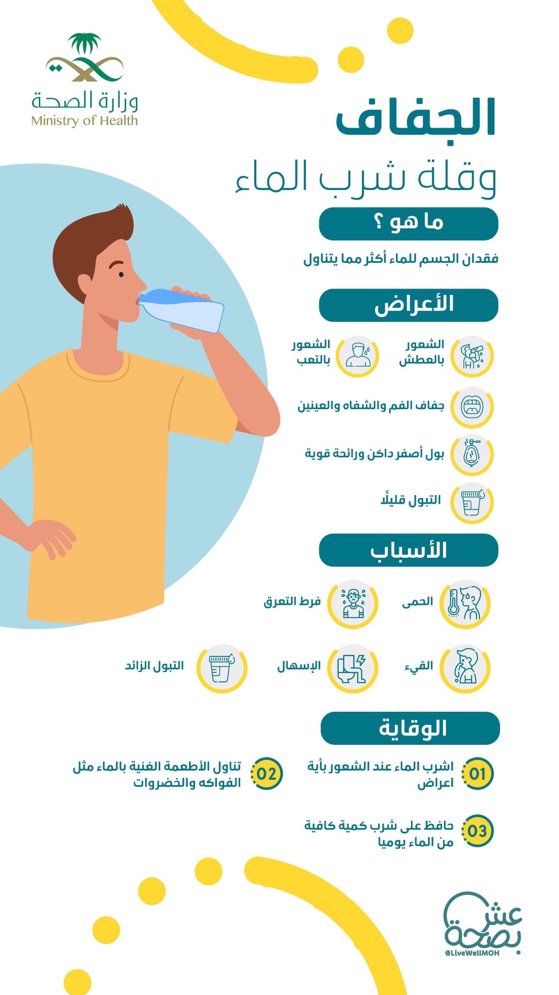 أوضحت وزارة الصحة أن الجفاف وقلة شرب الماء عبارة عن فقدان الجسم للماء أكثر مما يتناول، مبينة أن أعراضه تتمثل في الشعور بالعطش والتعب وجفاف الفم والشفاه والعينين، وبول أصفر داكن ورائحة قوية، والتبول قليلا.