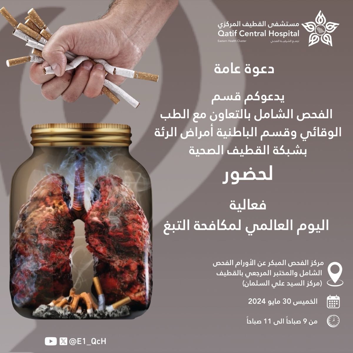 ينظم قسم الفحص الشامل المركزي، بالتعاون مع الطب الوقائي، وقسم الباطنية وأمراض الرئة بشبكة القطيف الصحية فعالية ”اليوم العالمي لمكافحة التبغ“، يوم الخميس 30 مايو في مركز الفحص المبكر عن الأورام الفحص الشامل والمختبر المرجعي بالقطيف ”مركز السيد علي السلمان“، من الساعة التاسعة إلى الساعة 11 صباحًا.
