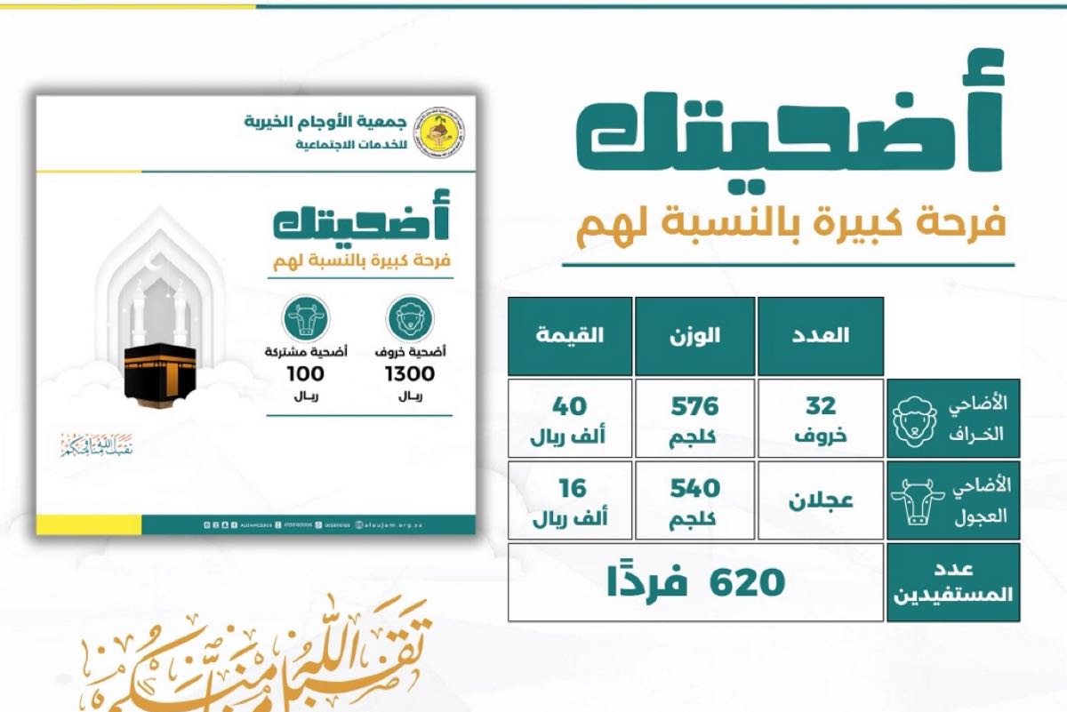 وأوضحت الجمعية أن الأضاحي شملت عجلين بوزن 540 كيلو جرامًا، وبقيمة 16 ألف ريال، و 32 خروفًا بوزن 576 كيلو جرامًا، وبقيمة 40 ألف ريال، استفاد منها 620 فردًا.