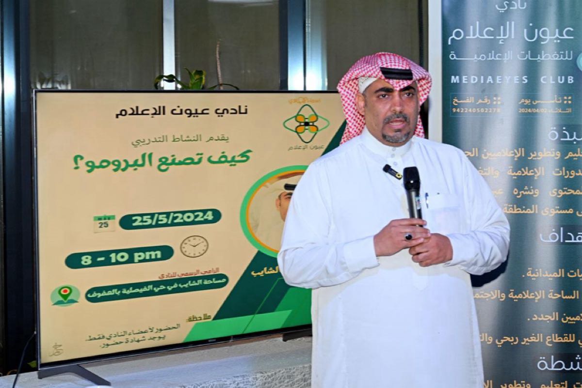 أقام نادي عيون الإعلام للتغطيات الإعلامية فعالية بعنوان ”كيف تصنع البرومو؟“، قدمها نائب رئيس النادي الإعلامي موسى الشايب، بحضور 18 إعلاميًا وإعلامية من الأعضاء، وذلك في مساحة الشايب التابعة لشركة عبدالله الشايب للاستشارات الهندسية الراعي الرسمي للنادي، في حي الفيصلية بالهفوف.