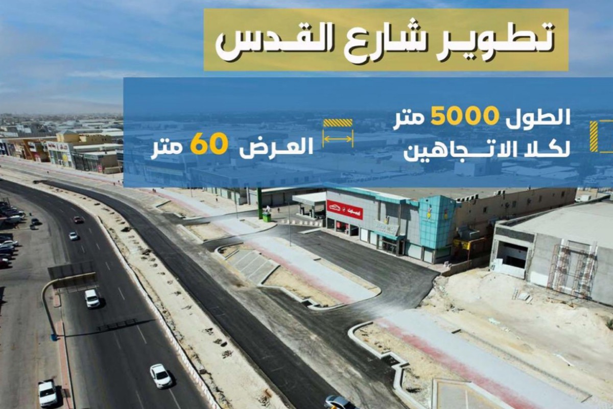 وتعمل ”البلدية“ على تطوير 4 طرق وشوارع تتضمن طريق الملك عبد العزيز بطول 5000 متر وعرض 60 مترًا، وشارع القدس بطول 5000 متر لكلا الاتجاهين، وعرض 60 مترًا.