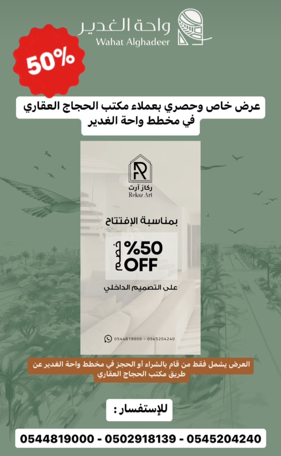 كما يعلن مكتب الحجاج العقاري عن مجموعة مشاريع سكنية مميزة في مخطط واحة الغدير