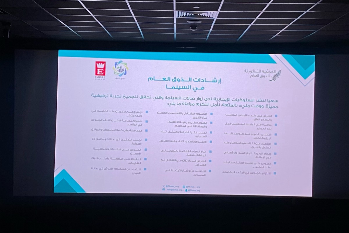 وأوضح مدير عام الجمعية، عبدالعزيز المحبوب، أن البرنامج يهدف إلى نشر إرشادات توعوية حول الذوقيات الواجب التحلي بها داخل صالات السينما، وذلك من خلال عرض عبارات إرشادية قبل بدء عرض الأفلام. بما يضمن تحسين تجربة زوار ومرتادي صالات السنيما، واستدامة الممتلكات والمرافق العامة، وراحة ومتعة الجميع، بما يتماشى مع تطلعات قيادتنا الرشيدة ورؤية المملكة 2030 في تعزيز جودة الحياة.