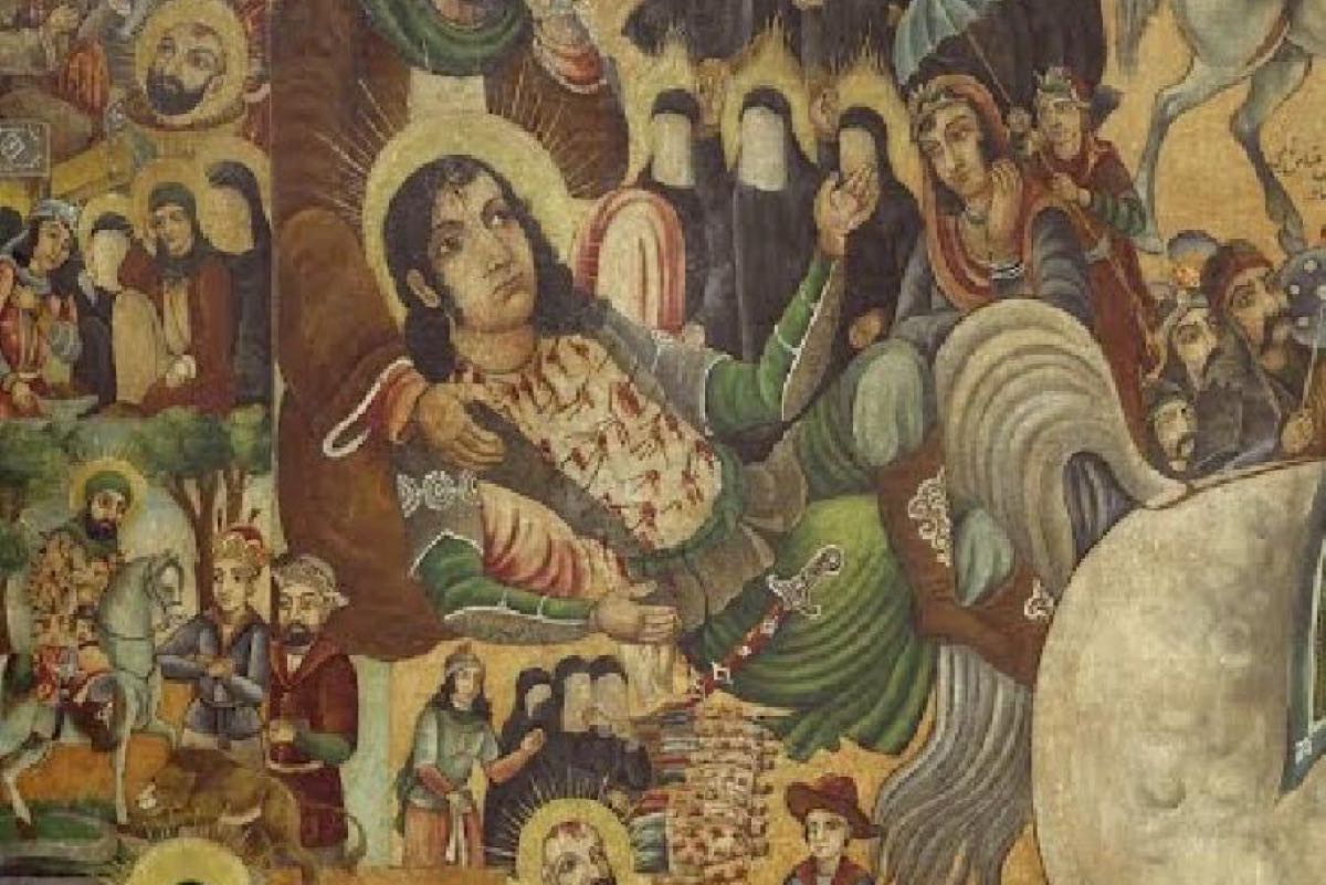 رسمها الفنان الإيراني ”عباس الموسوي“ على القماش بالزيت في مدينة اصفهان في أواخر القرن التاسع عشر وأوائل القرن العشرين خلال الفترة القاجارية، مقاسها 182,9×299,7 سم، وقعت تحت دراويش عباس بوفاسي - اصفهان وقد عثر على نقشين مهمين بالفارسية باسم الفنان على صدر اللوحة» - انتهى الاقتباس -