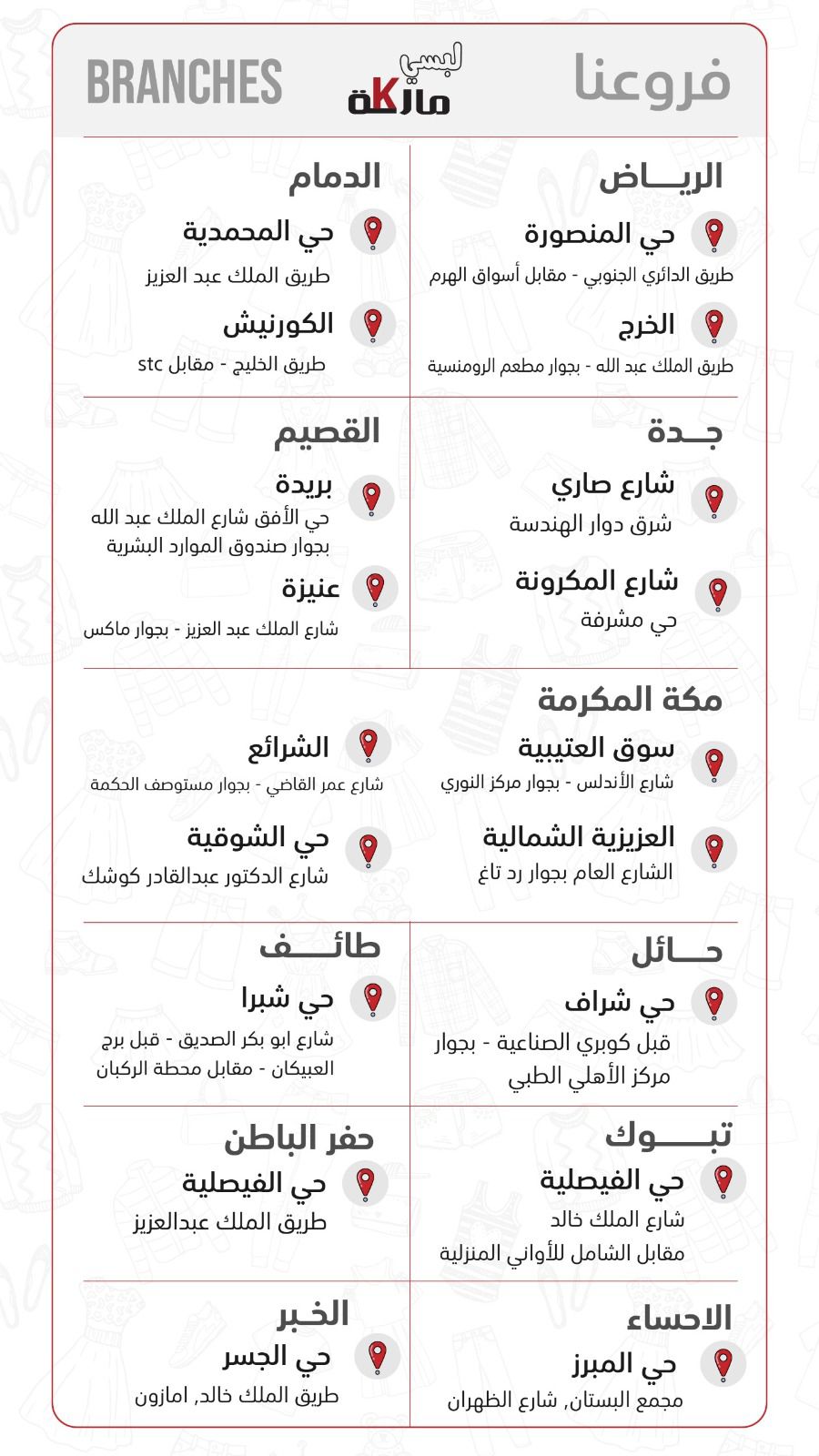 الرياض - جدة - مكة المكرمة - الطائف - القصيم - الدمام - حائل - تبوك - الخرج - حفر الباطن - الأحساء - الخبر