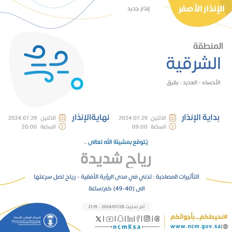 وأصدر المركز الوطني للأرصاد إنذارًا أصفرًا يشمل مدن ومحافظات القطيف، الدمام، الجبيل، الخبر، رأس تنورة، الأحساء، العديد، بقيق، الخفجي، النعيرية، حفر الباطن، وقرية العليا، محذرًا من استمرار حالة الرياح الشديدة حتى السابعة مساءً.