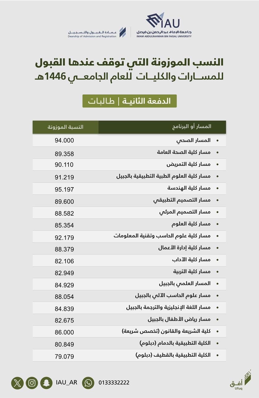 جامعة الإمام عبدالرحمن بن فيصل تعلن الدفعة الثانية من المقبولين