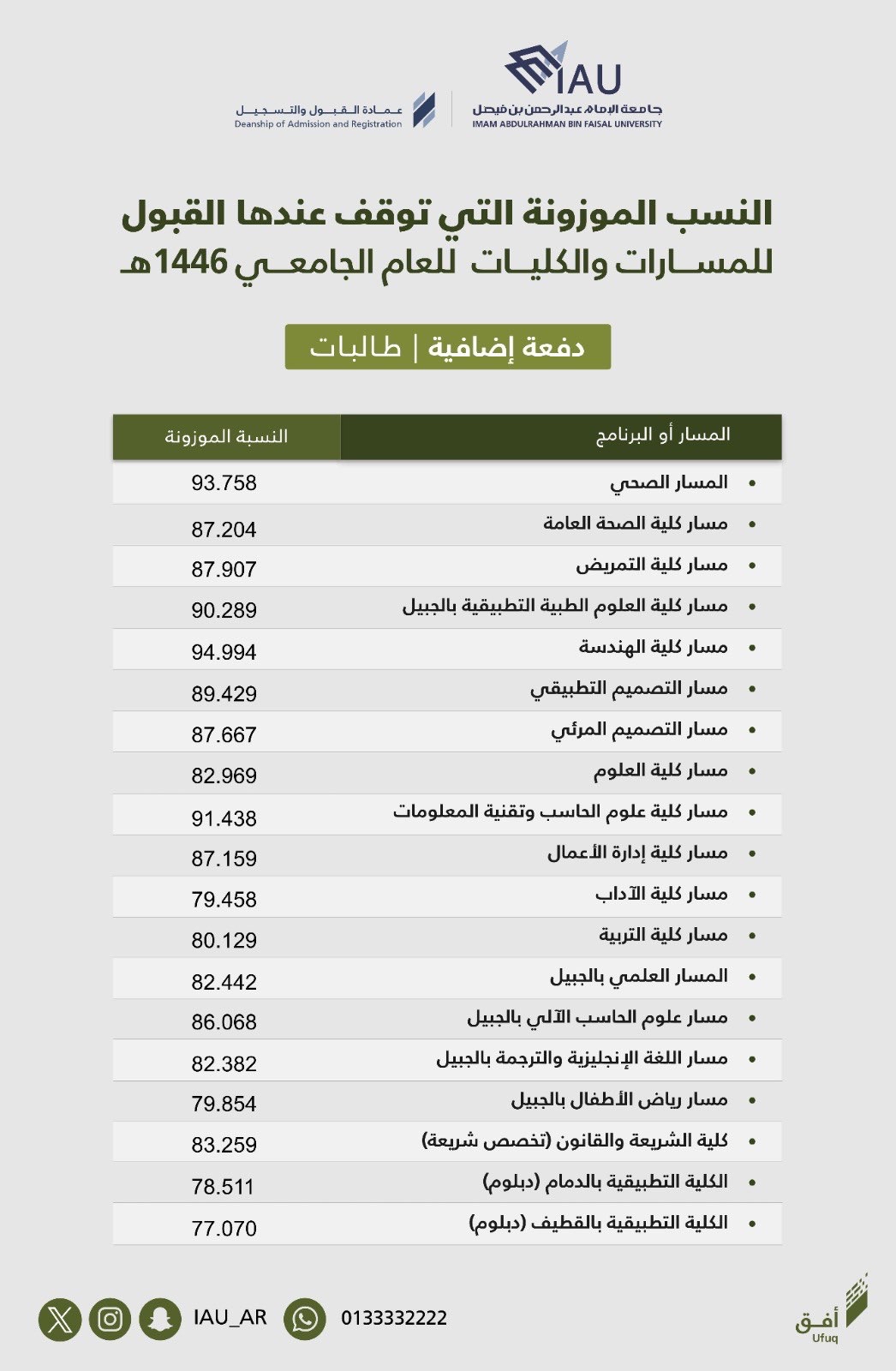 أعلنت جامعة الإمام عبدالرحمن بن فيصل، اليوم الأحد، عن إطلاق دفعة إضافية من المرشحين والمرشحات للقبول في العام الدراسي الجامعي 1446 هـ. في خطوة تعكس حرصها على استيعاب أكبر عدد من الطلاب والطالبات.