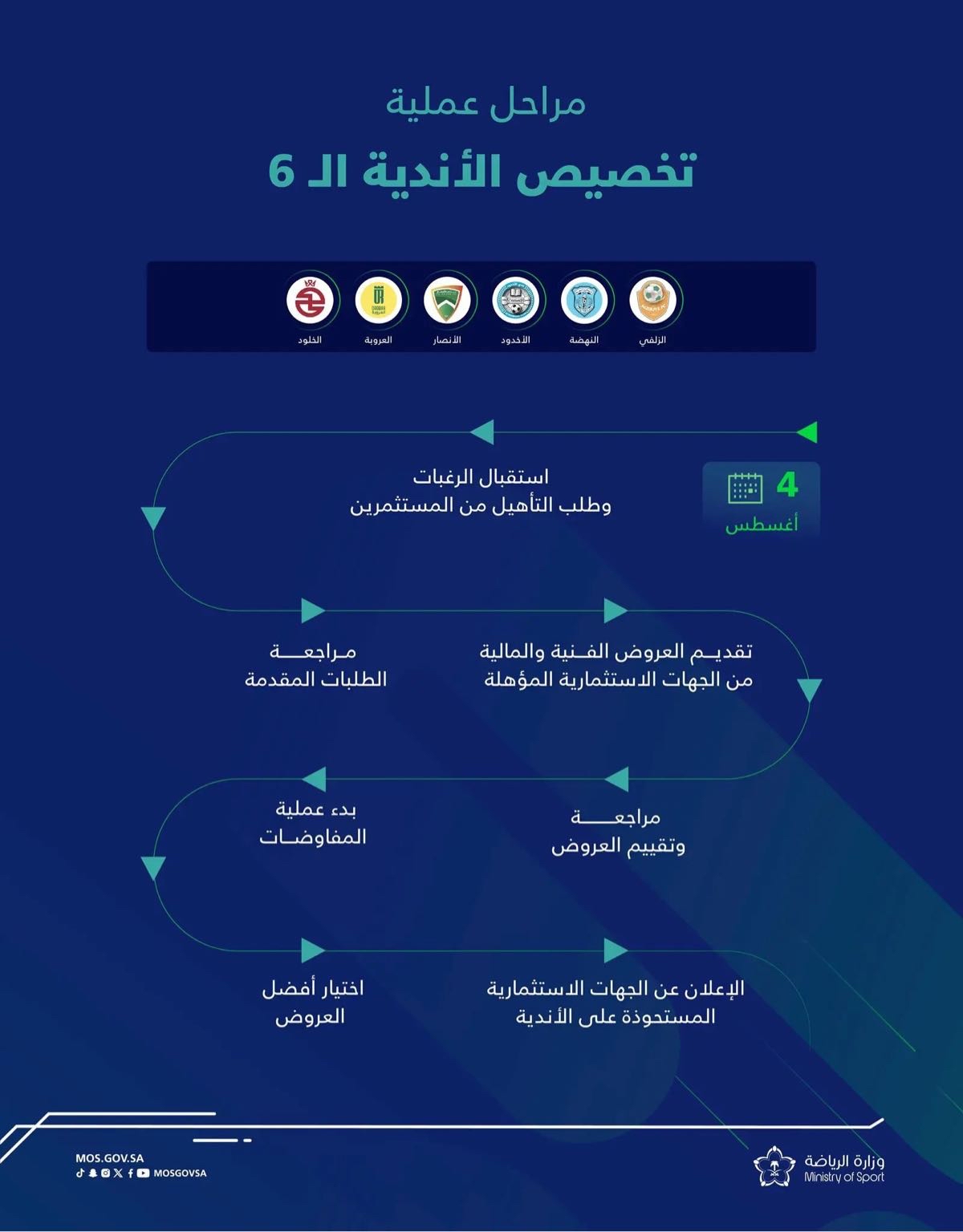 ويأتي ذلك استكمالًا لتنفيذ مشروع الاستثمار والتخصيص للأندية الرياضية الذي أطلقه سمو ولي العهد؛ تحقيقًا لمستهدفات رؤية المملكة 2030، ومنح الفرص للقطاع الخاص للمشاركة في بناء وتنمية القطاع الرياضي، بما يحقق الفائدة المرجوة للمنتخبات الوطنية والأندية والممارسين للرياضة كافة.