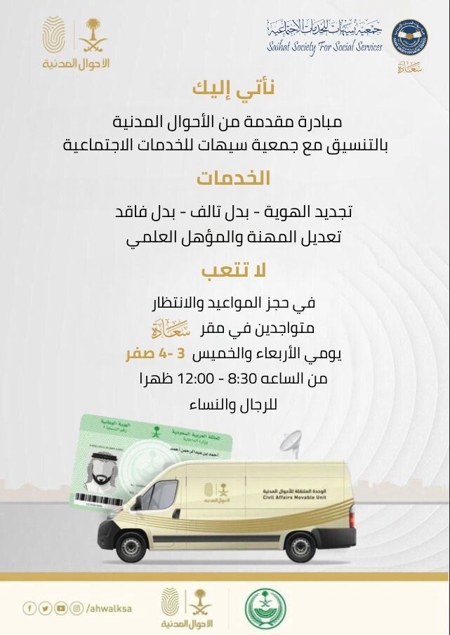 أطلقت إدارة الأحوال المدنية، بالتعاون مع جمعية سيهات للخدمات الاجتماعية ”سعادة“، المبادرة الثالثة من ”نأتي إليك“، في النصف الثاني من هذا العام، بهدف تقديم الخدمات المختلفة للمواطنين، في مقر الجمعية.