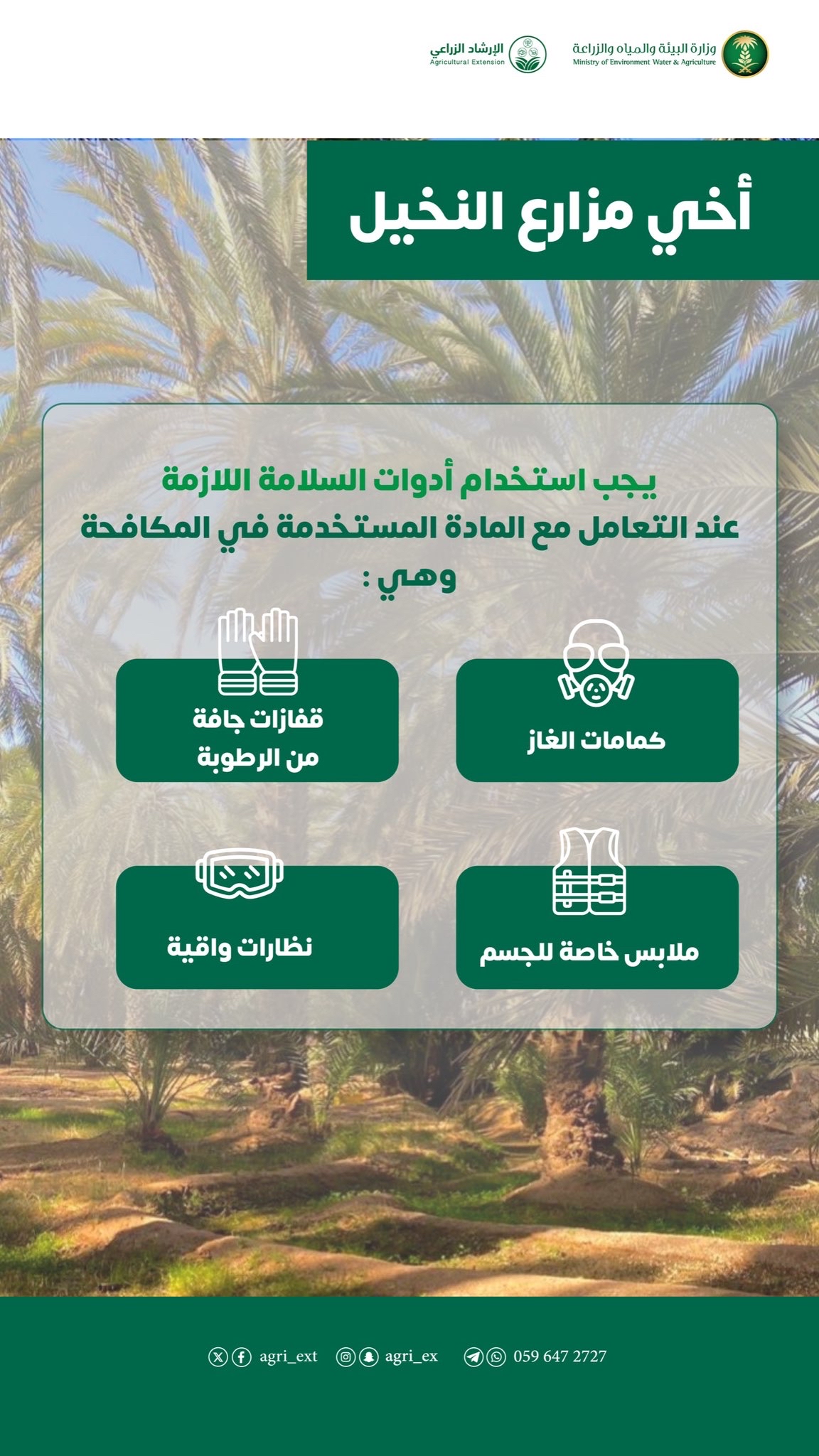 شددت مديرية الإرشاد الزراعي على ضرورة استخدام أدوات السلامة اللازمة عند التعامل مع المواد المستخدمة في مكافحة آفات النخيل، وذلك حفاظاً على سلامة المزارعين والعاملين في هذا المجال.