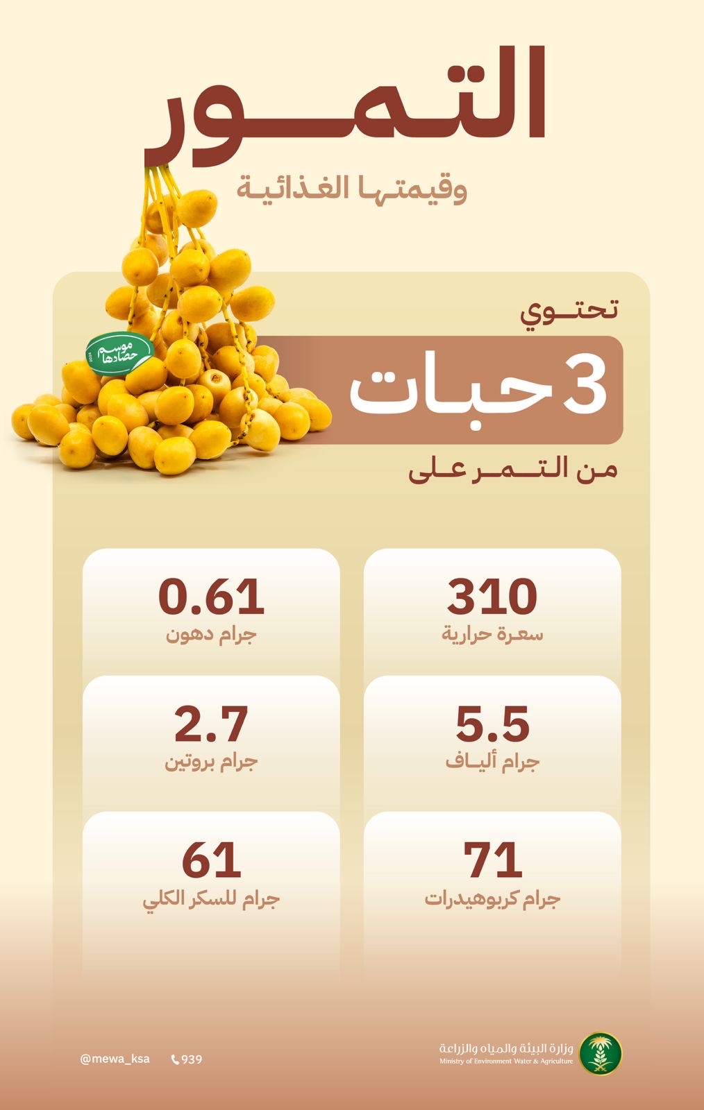 أكدت وزارة البيئة والمياه والزراعة، أن ثلاث حبات من التمر تحتوي على العديد من العناصر الغذائية، وتناولها يمد الجسم بـ 310 سعرات حرارية، و 71 جرامًا من الكربوهيدرات، و 61 جرامًا من السكر، و 5,5 جرامات من الألياف، و 2,7 جرامات من البروتين، ونحو 0,61 جرامًا من الدهون، إذ تعتبر التمور من المحاصيل الواعدة التي تعمل الوزارة على تطوير إنتاجها وتصنيعها وتسويقها محليًا ودوليًا.