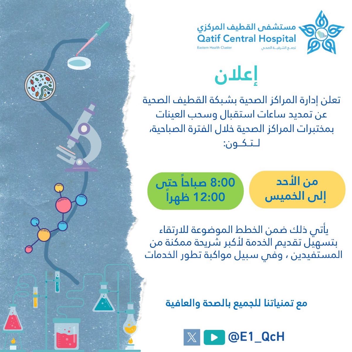 أعلنت إدارة المراكز الصحية بشبكة القطيف الصحية عن تمديد ساعات استقبال وسحب العينات بمختبرات المراكز الصحية خلال الفترة الصباحية، لتكون من الساعة 8:00 صباحاً حتى 12:00 ظهراً، وذلك من الأحد إلى الخميس.