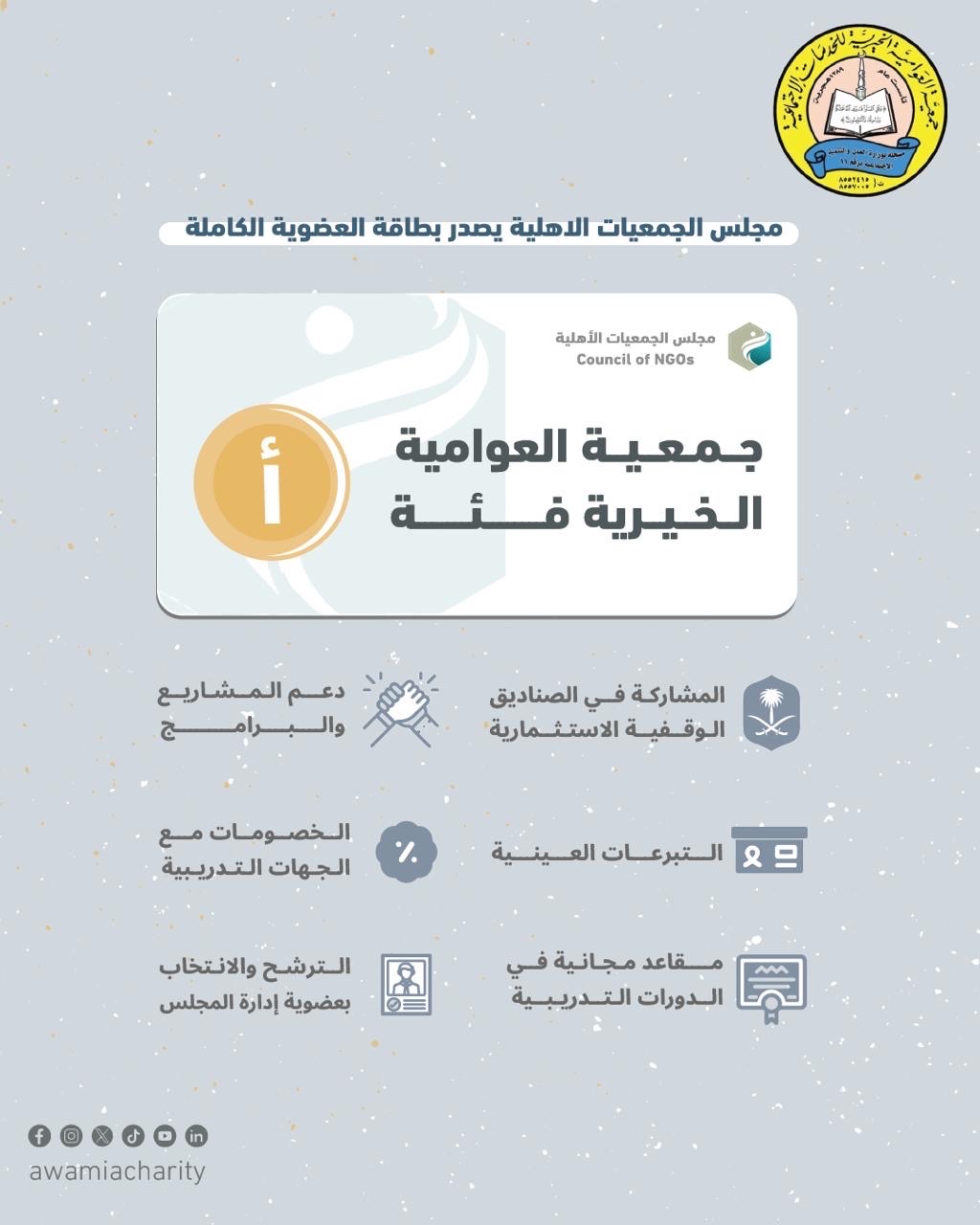 حصلت جمعية العوامية الخيرية، على بطاقة العضوية الكاملة فئة ”أ“، من مجلس الجمعيات الأهلية، والتي تؤهلها لعضوية الجمعية العمومية لمجلس الجمعيات الأهلية بالمنطقة الشرقية.