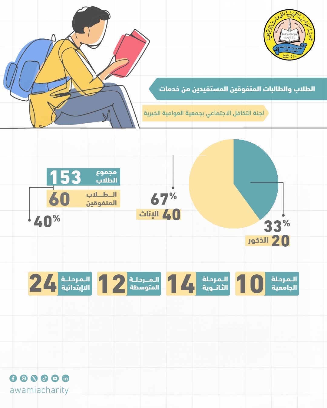 حقق 60 طالبًا وطالبة من مستفيدي جمعية العوامية الخيرية للخدمات الاجتماعية تفوقًا دراسيًا ملحوظًا في مختلف المراحل الدراسية، بدءًا من المرحلة الابتدائية وصولًا إلى الجامعية.