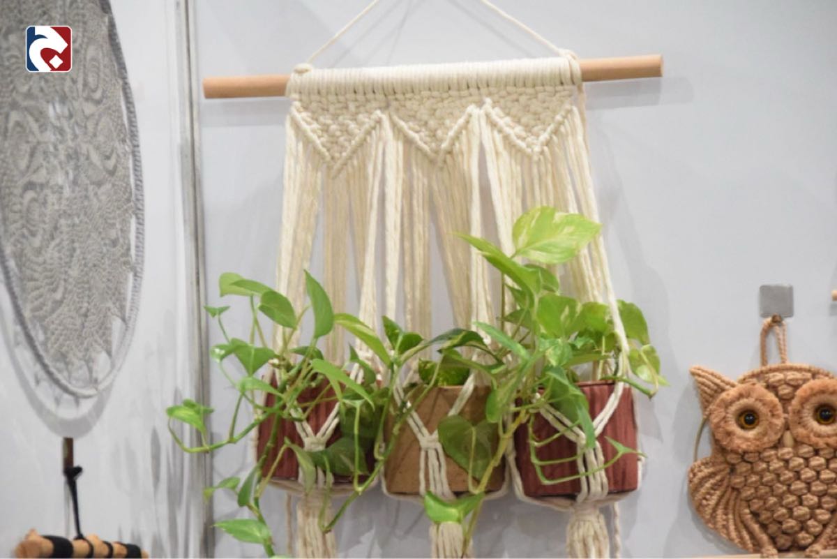 وعرضت ضحى أخضر فن المكرميات أو فن العقدة، وهو فن تراثي يستخدم فيه الحبال لصنع منتجات متنوعة.
