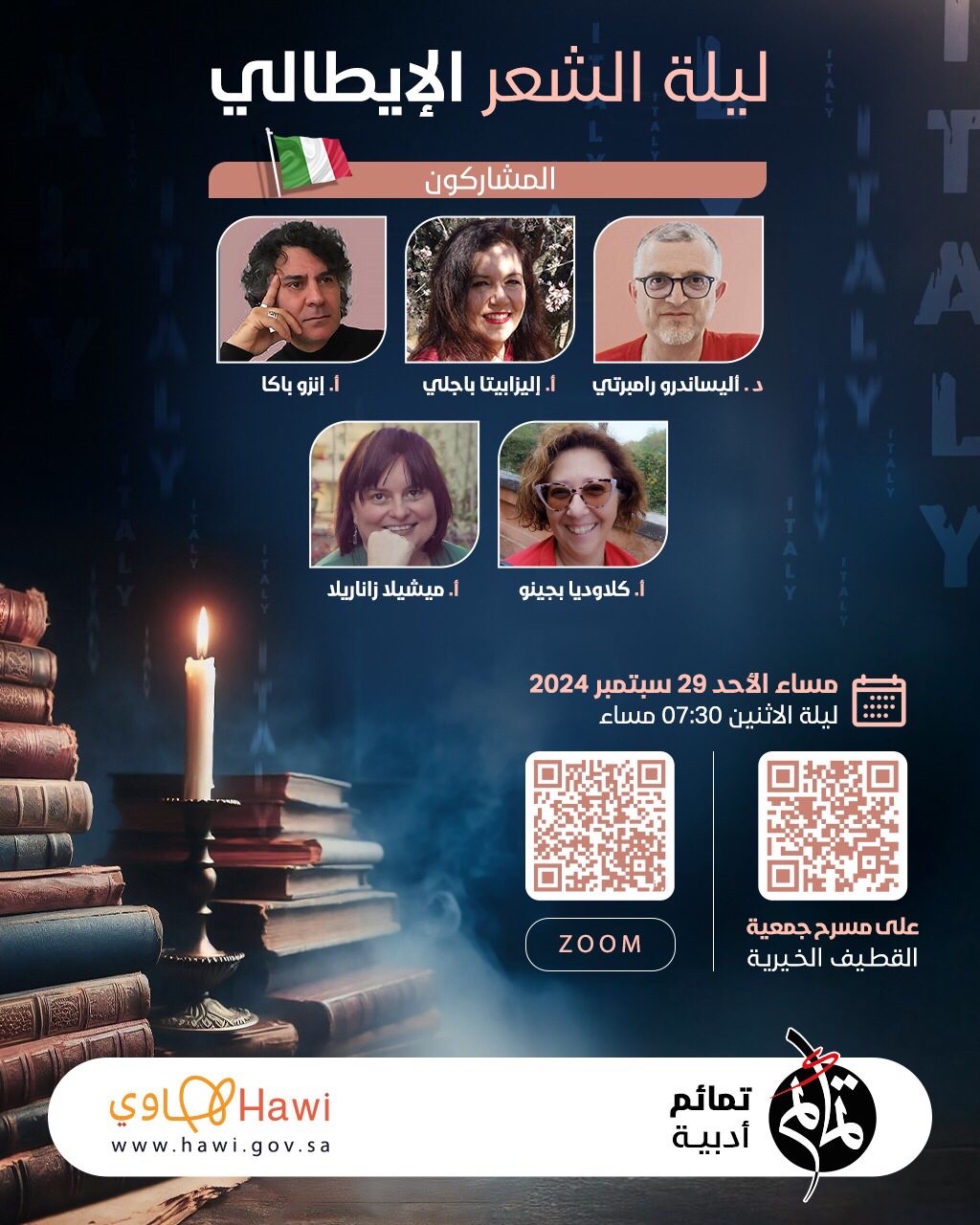 وشهدت الأمسية، التي أقيمت على مسرح جمعية القطيف الخيرية وعبر منصة ”زوم“، مشاركة الشعراء الإيطاليين د. أليساندرو رامبرتي، كلاوديا بجينو، إليزبيتا باجلي، إنزو باكا وميشيلا زاندريلا، الذين ألقوا قصائدهم على الحضور عبر البث المباشر.