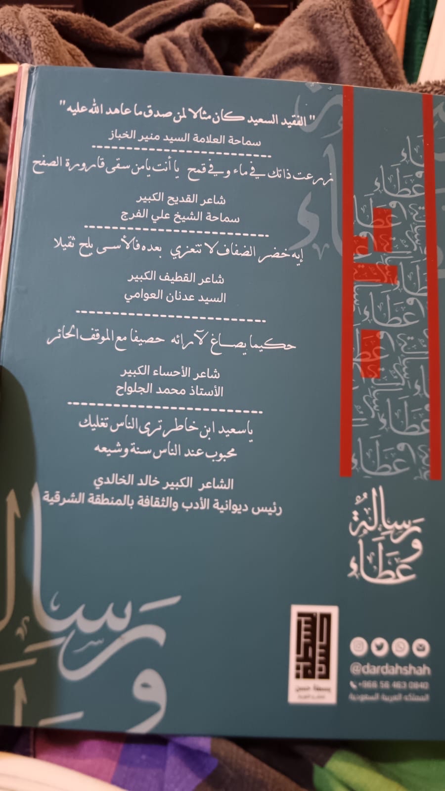الكتاب يحتضن بين صفحاته قصائد ومقالات أدبية كتبت في رثاء الحاج الملا سعيد الخاطر، تبرز إنجازاته الاجتماعية والوطنية، وتعكس الحزن العميق لخسارة هذه الشخصية العظيمة. إلى جانب الكلمات المؤثرة، يضم الكتاب صورًا توثق مسيرته الحافلة، ما يمنح القارئ رؤية أوضح عن حياة الراحل ومساهماته المتعددة.