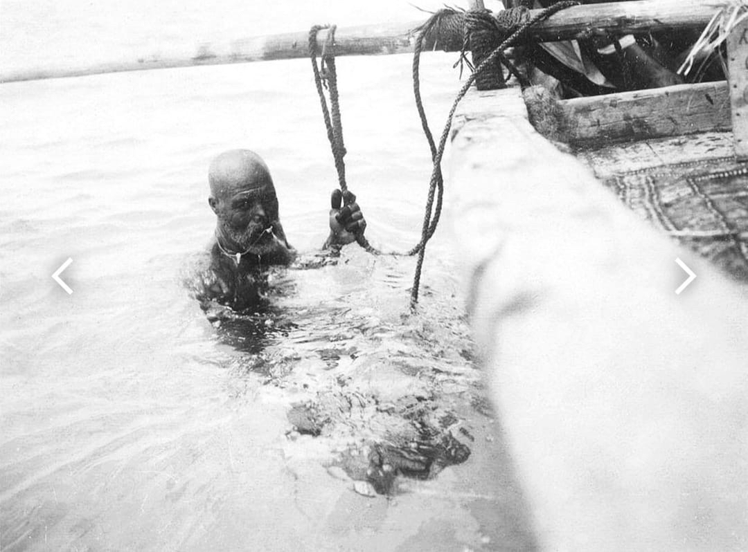وعن تقاليد نزول الغواصين لأعماق البحر يخبرنا الشاب عبدالله التركي الذي تخلى عن وظيفة التباب وأصبح غواصا بعد أن وثق به عمه واطمأن أبيه عليه بعد محاولات متدرجة وجسارة متوالية، يوصف لنا مشهدية العمل بلهجة أهل البحر التي اكتسبها سنينا بقلب حرف الجيم لحرف الياء ”وصلنا للهير صاح النوخذة حجي تركي، نشروا المياديف، نزلوا لحياره، يالله اللي عليه لمگاحمه، نزلوا، أول تبه، طلعوا، يصيحوا، اوييييل الله، - تأتيه الأصوات بأعلى حناجرها - لا إله إلا الله، هذا وقت الصباح، وكل غيص قبل لا ينزل قاعد على التريچ وريوله في الماء، يقولوا بها الدعاء: نزلنا من دبر رب السماء، عليك يا حامي الحمى، - نهمة جماعية - من انهلز، نقول: آوييييل.. لا إله إلا الله، رزق اليوم أخذناه ورزق باچر على الله، وكل يوم وياك زيادة، والغوص عادة، والصلاة عبادة، أول ما نبدي العشاء وتالي الصلاة، صلينا على محمد وآل محمد، وكل واحد باسط على المنامات“.