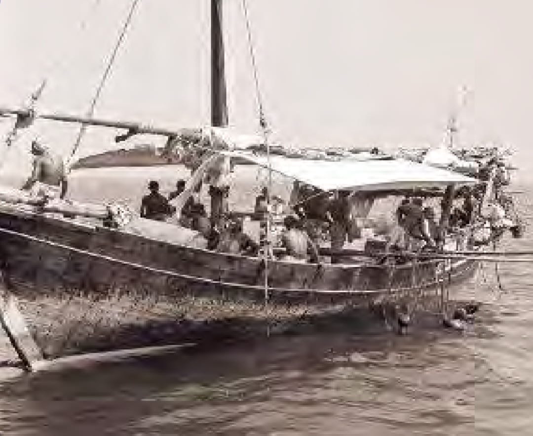 صباح ندي بالبهجة والطفل عبدالله التركي ذو الثمان سنوات يمد يداه لوالده وعمه عيسى ليصعدانه من قارب صغير ”جالبوت“ إلى سطح ”المحمل العود شريدة“ جلس متمددا في حيز ”الكاتلي“ شارد الفكر مفتونا من رأسه حتى قدميه.