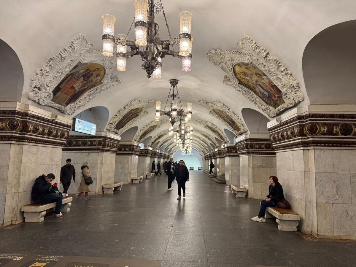 أثناء تجوالي في مدينة موسكو، يبرز مترو موسكو كتحفة حقيقية. إنه ليس مجرد وسيلة نقل، بل يعكس عظمة المدينة. كل محطة من محطات المترو مصممة بعناية، تشعر وكأنك تتنقل في قصور تحت الأرض. المحطات مزخرفة بالرخام والثريات الضخمة، وكل محطة تروي قصة تاريخية عبر تصميمها المعماري الفريد. على سبيل المثال، محطة“بيلوروسكايا”تكرم المحاربين البيلاروسيين الذين دافعوا عن البلاد خلال الحرب العالمية الثانية.