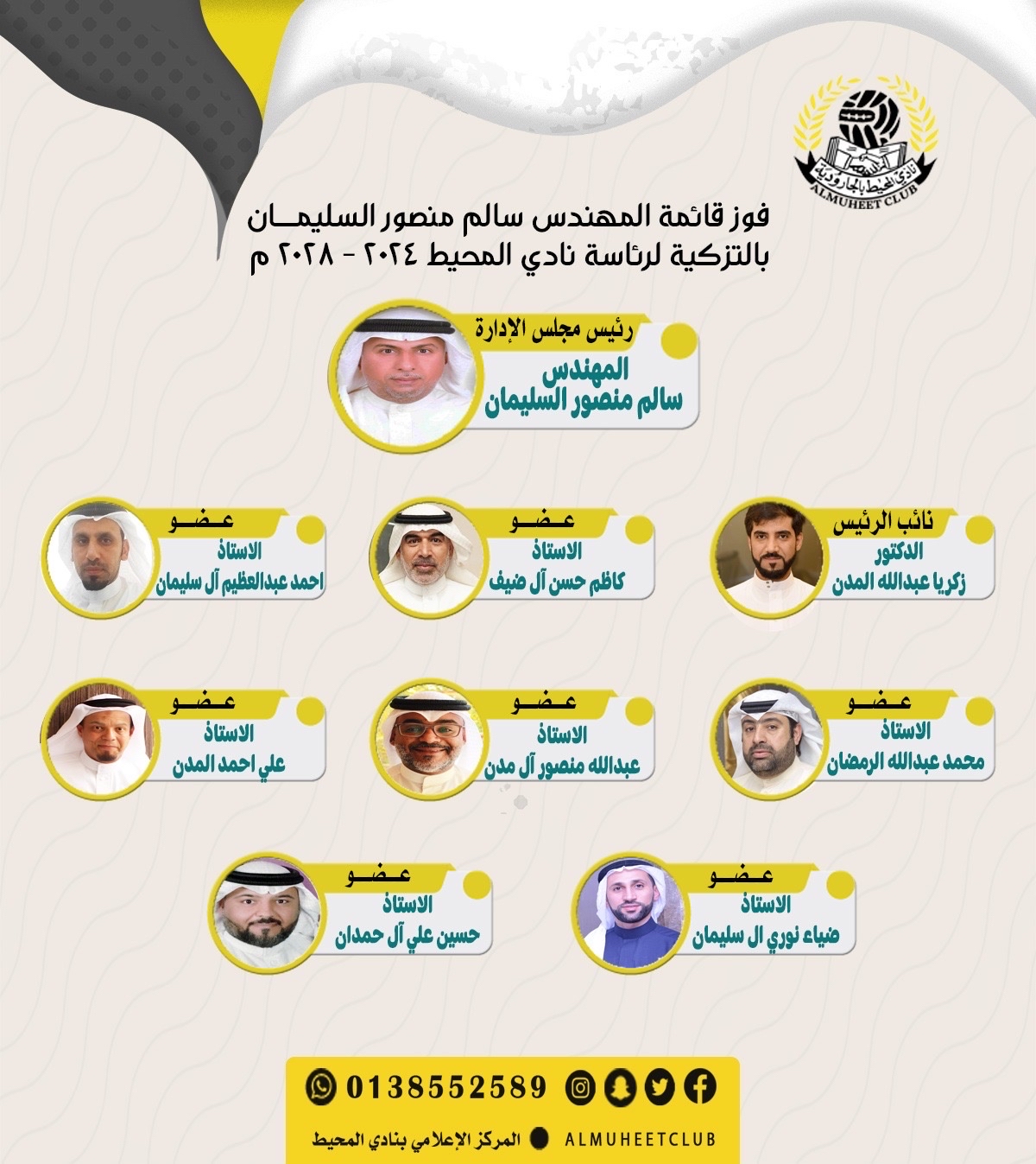 فاز المهندس سالم منصور السليمان برئاسة نادي المحيط بالتزكية، وذلك للدورة الانتخابية 2024 - 2028.